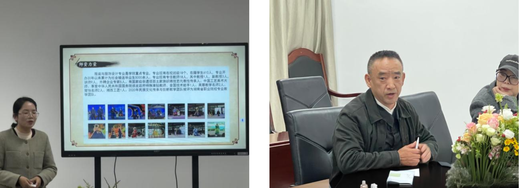 服装教研室主任胡元霞详细介绍了专业建设与人才培养方案。双方一致认为需打破传统育人模式,实现全链条贯通培养。株洲市炎帝服饰文化研究会执行会长李永忠提出,应挖掘湘西文化底蕴,将其融入设计与产业实践,培养具有地域特色的创新人才。